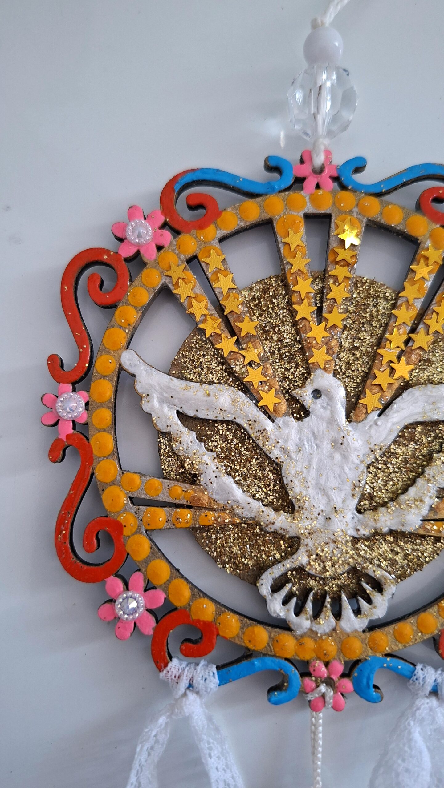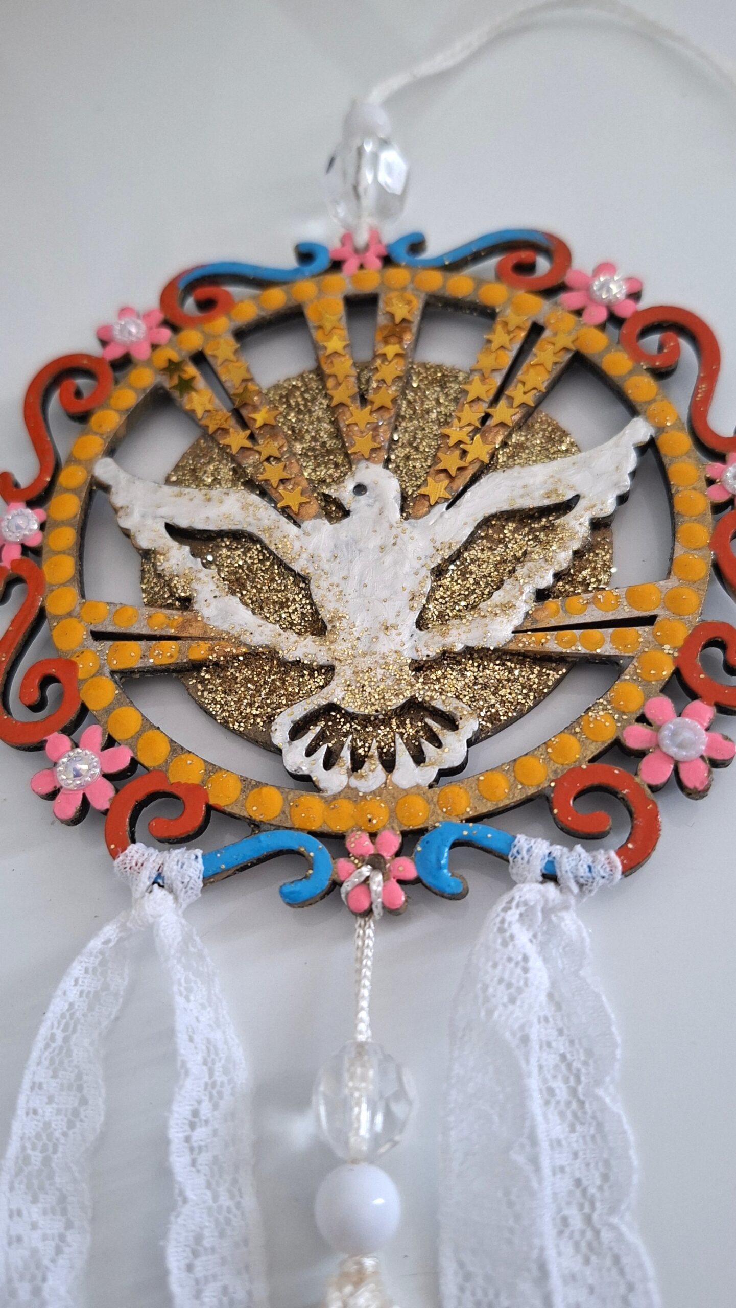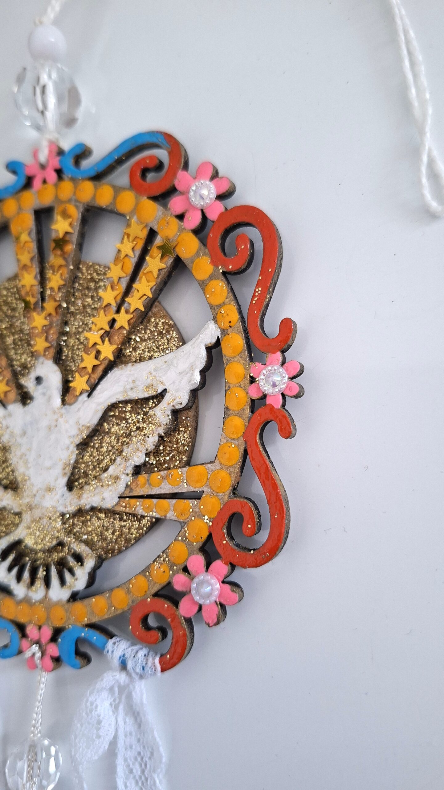 As peça são envernizadas e contém aplicação de cristais adesivos e/ou espelhinhos.