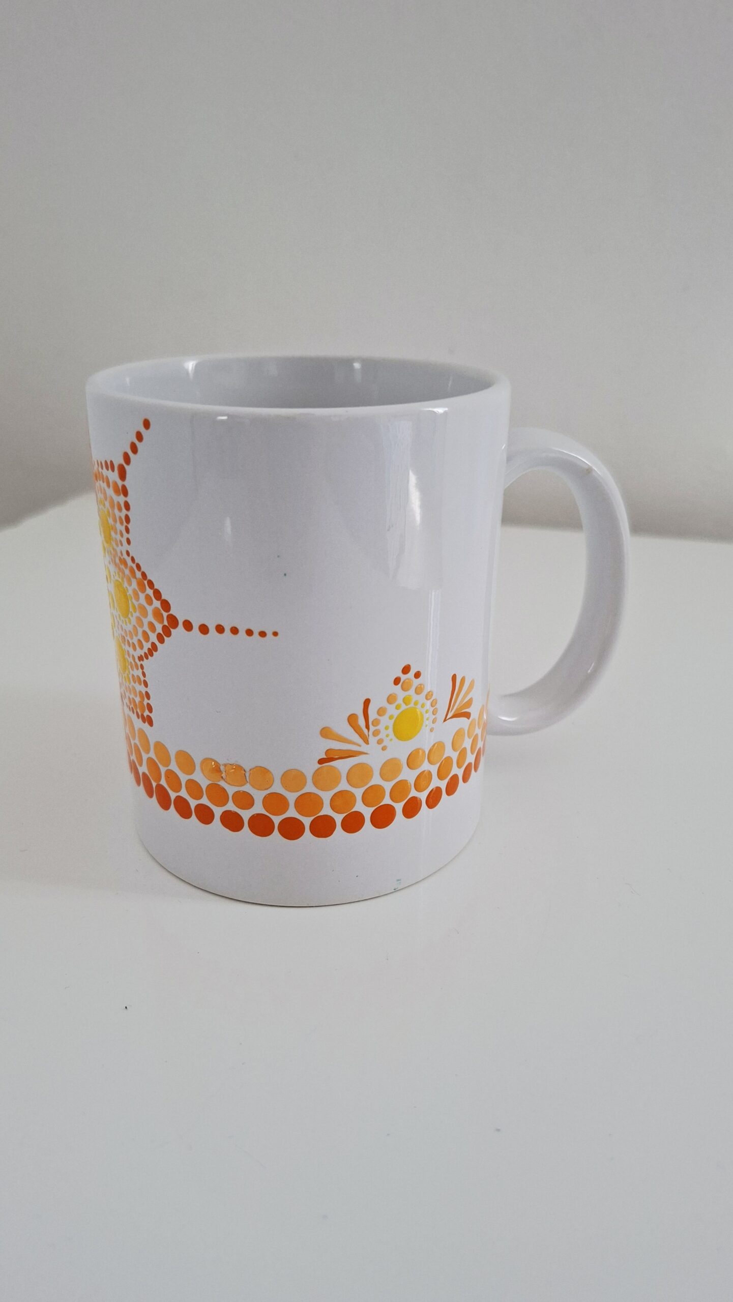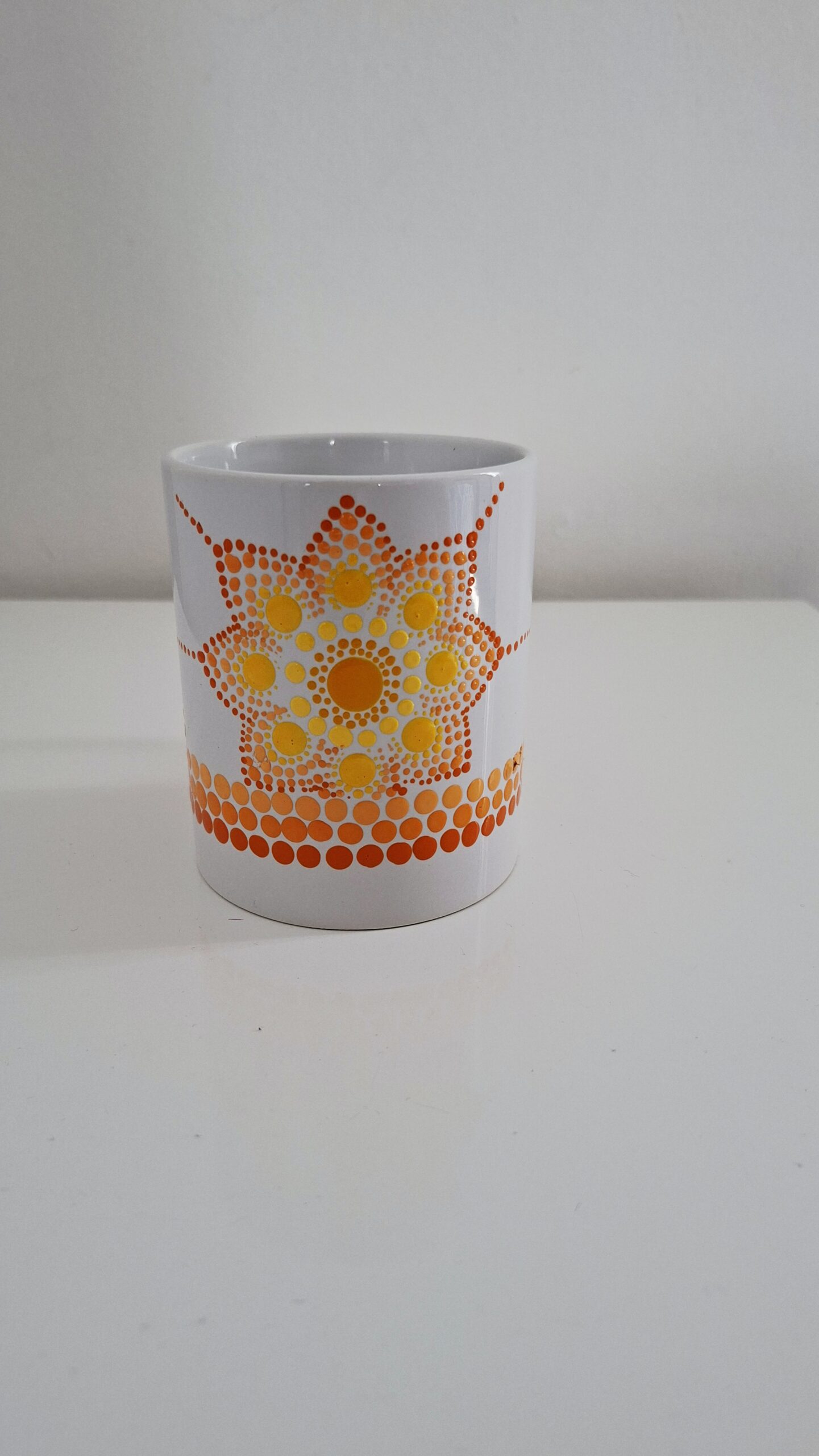 Caneca meia mandala: pintada em um dos lados de azul com detalhe amarelo.