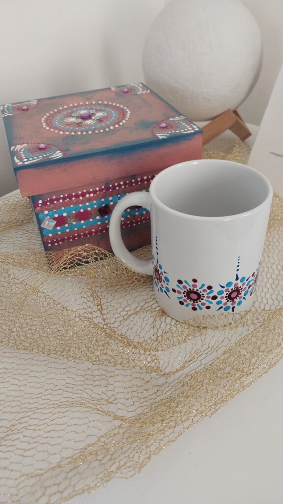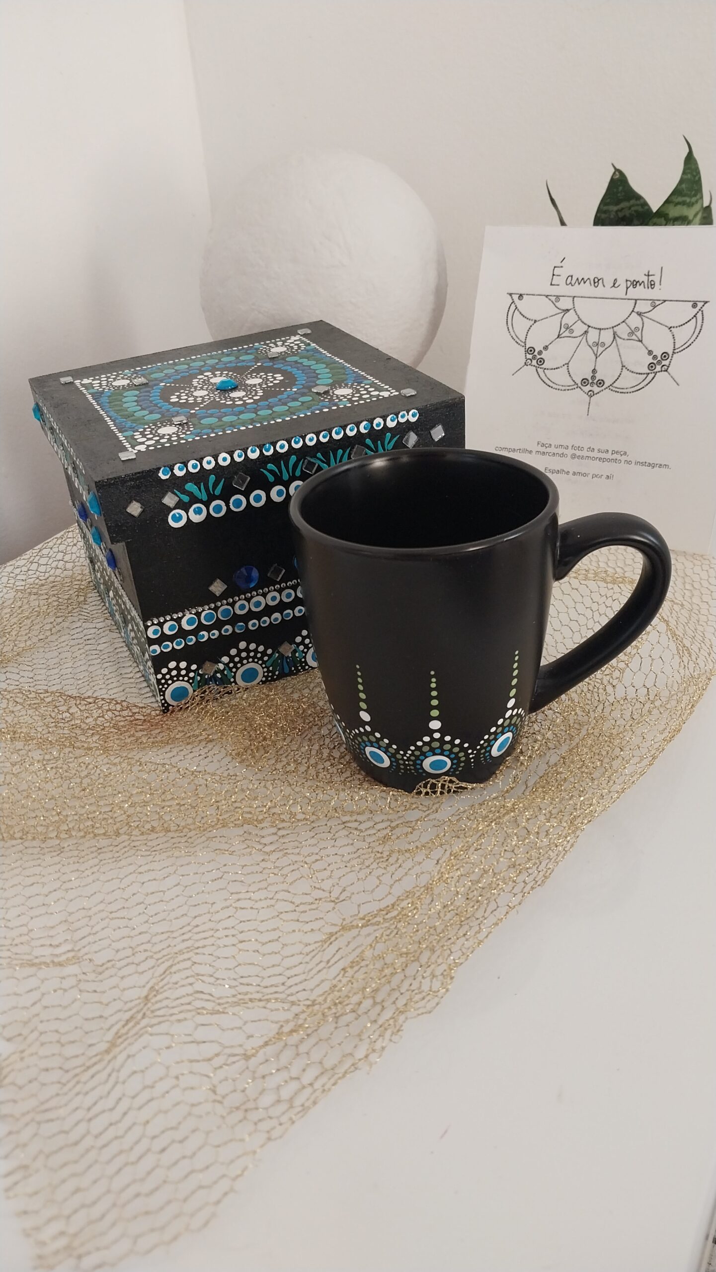 Enquanto a caneca é destinada para utilidades domésticas a caixa se torna um excelente porta-objetos ou até mesmo uma arte para decoração.