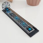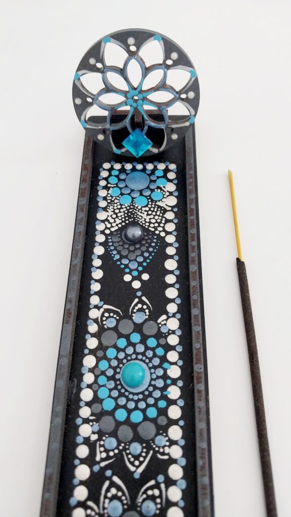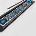 O compartimento alongado deste incensário recebe toda a cinza queimada e não suja o local em que está apoiado.