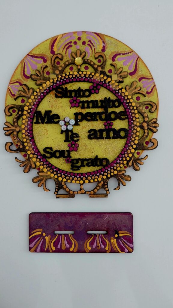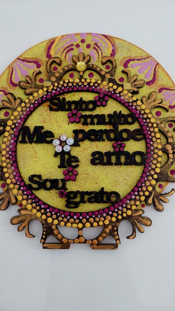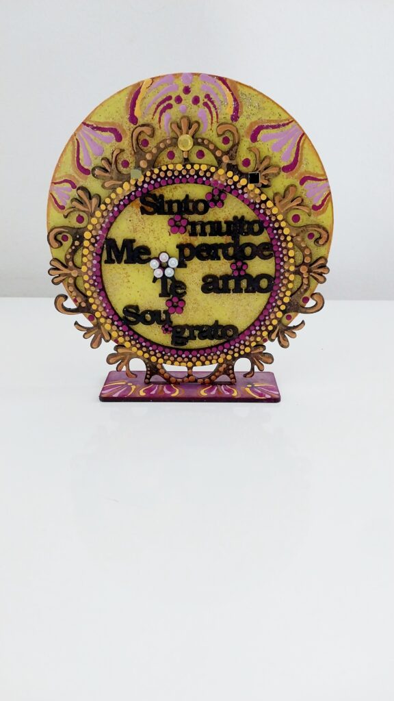 Dizeres: “sinto muito; me perdoe; te amo; sou grato” sobreposto em mandala pintada.