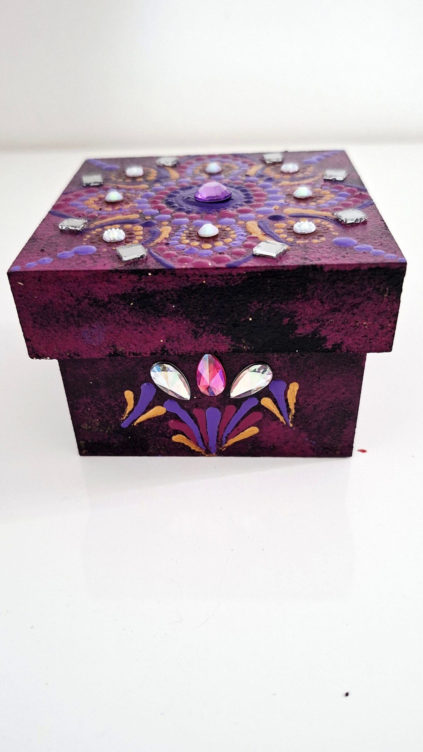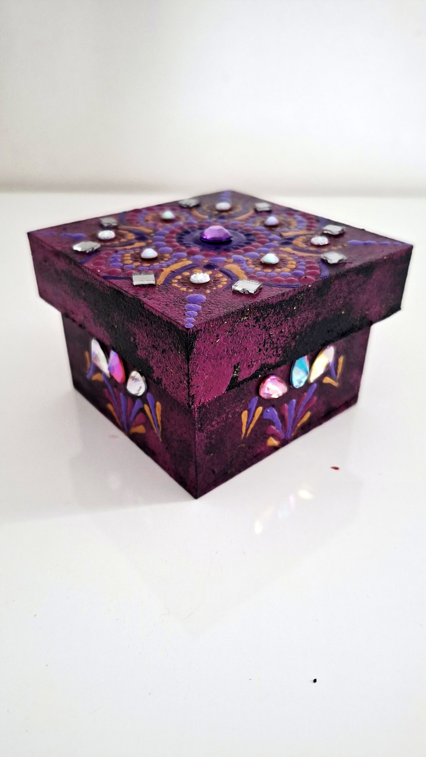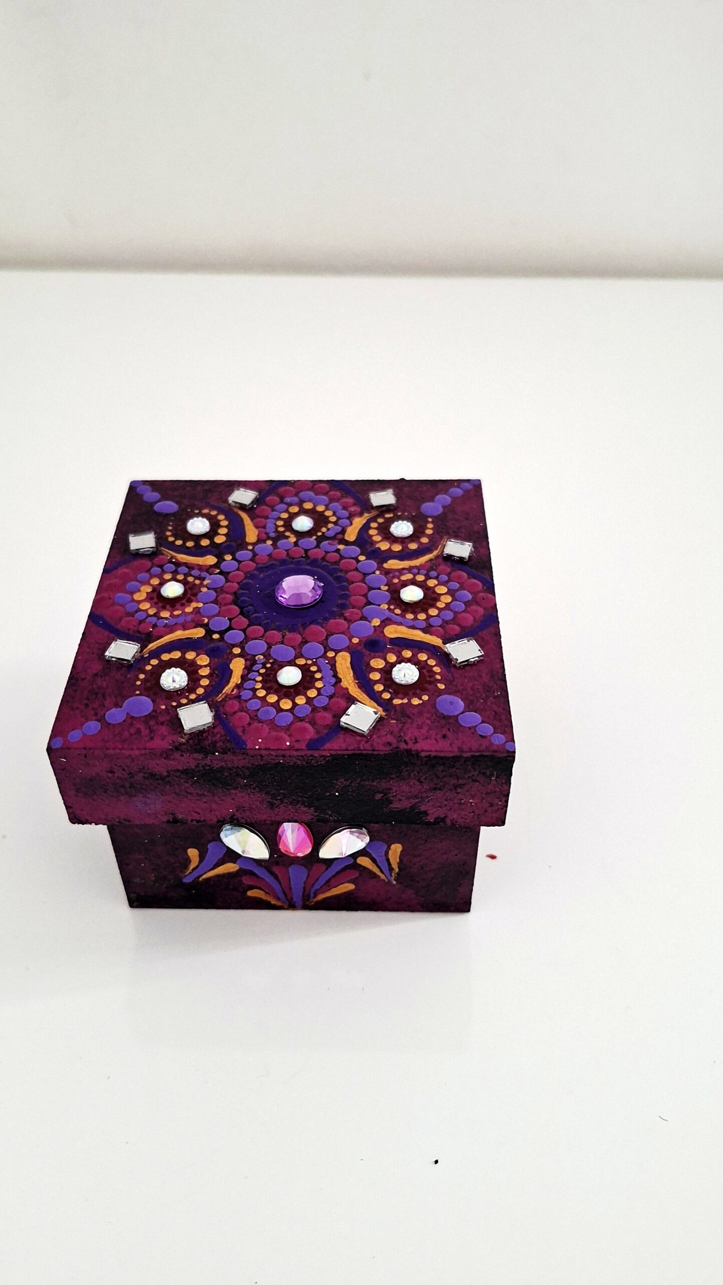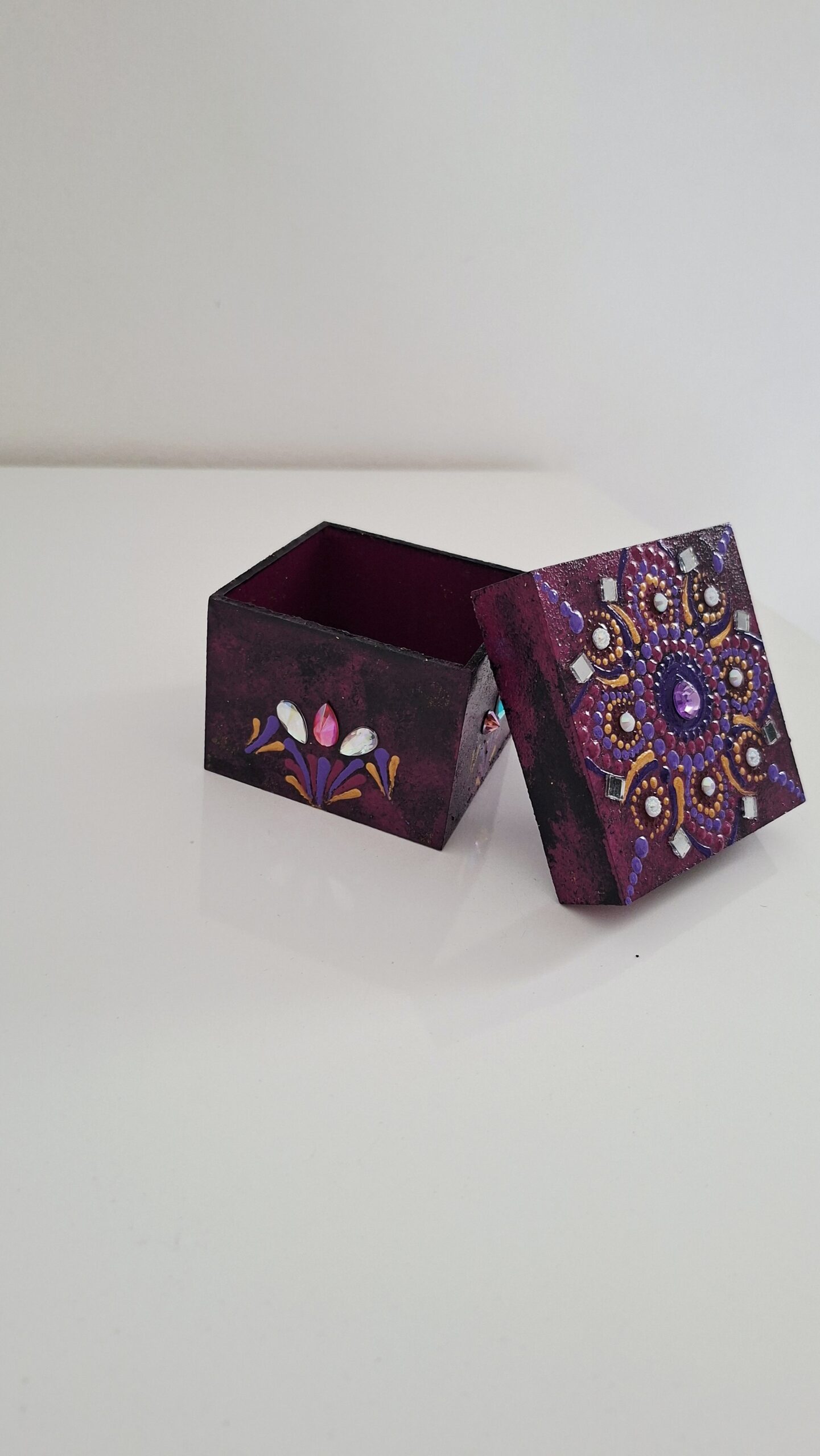 Caixinha com tampa, envernizada e com aplicação de cristal adesivo
