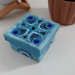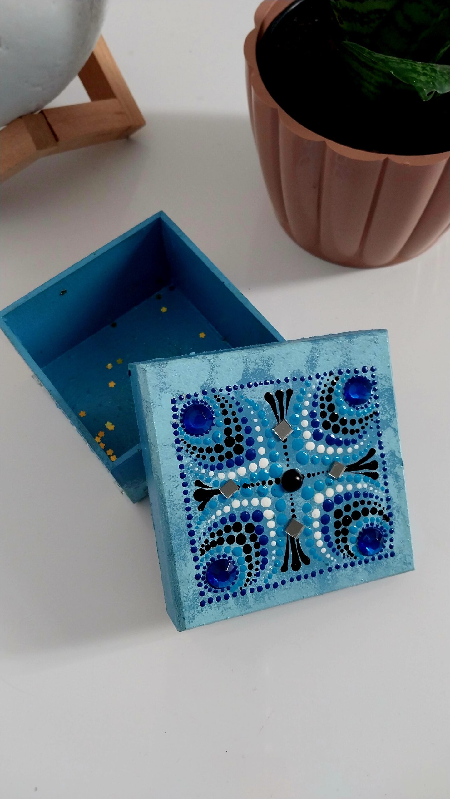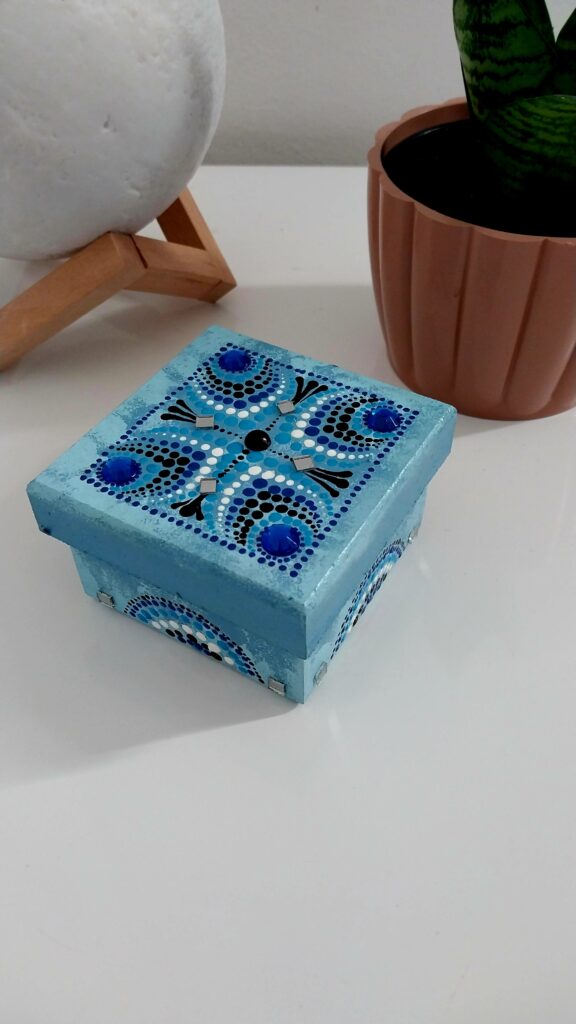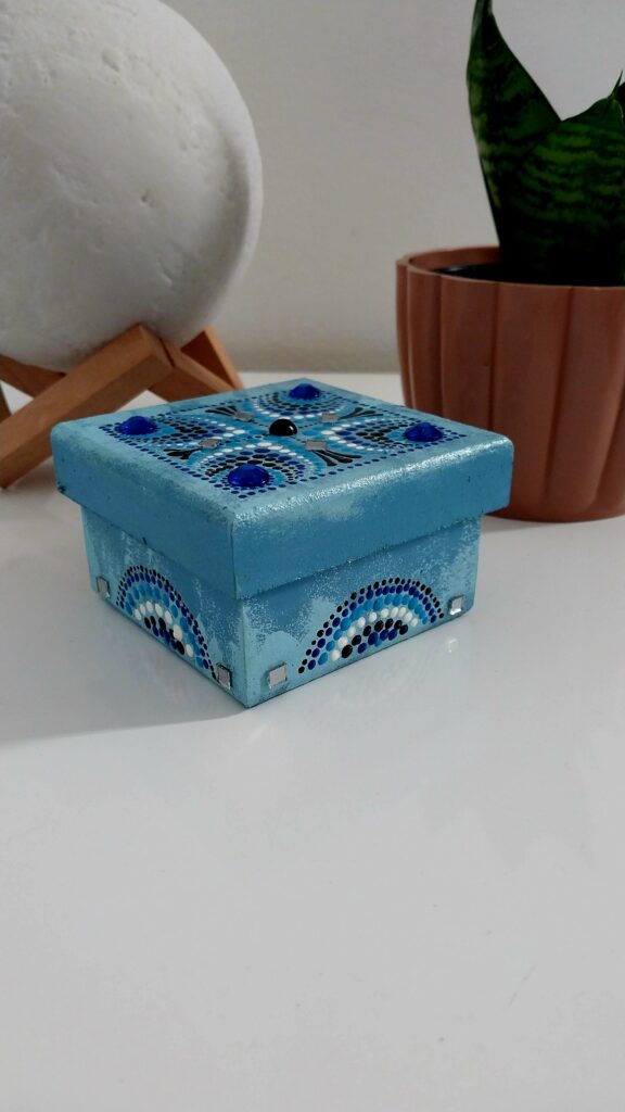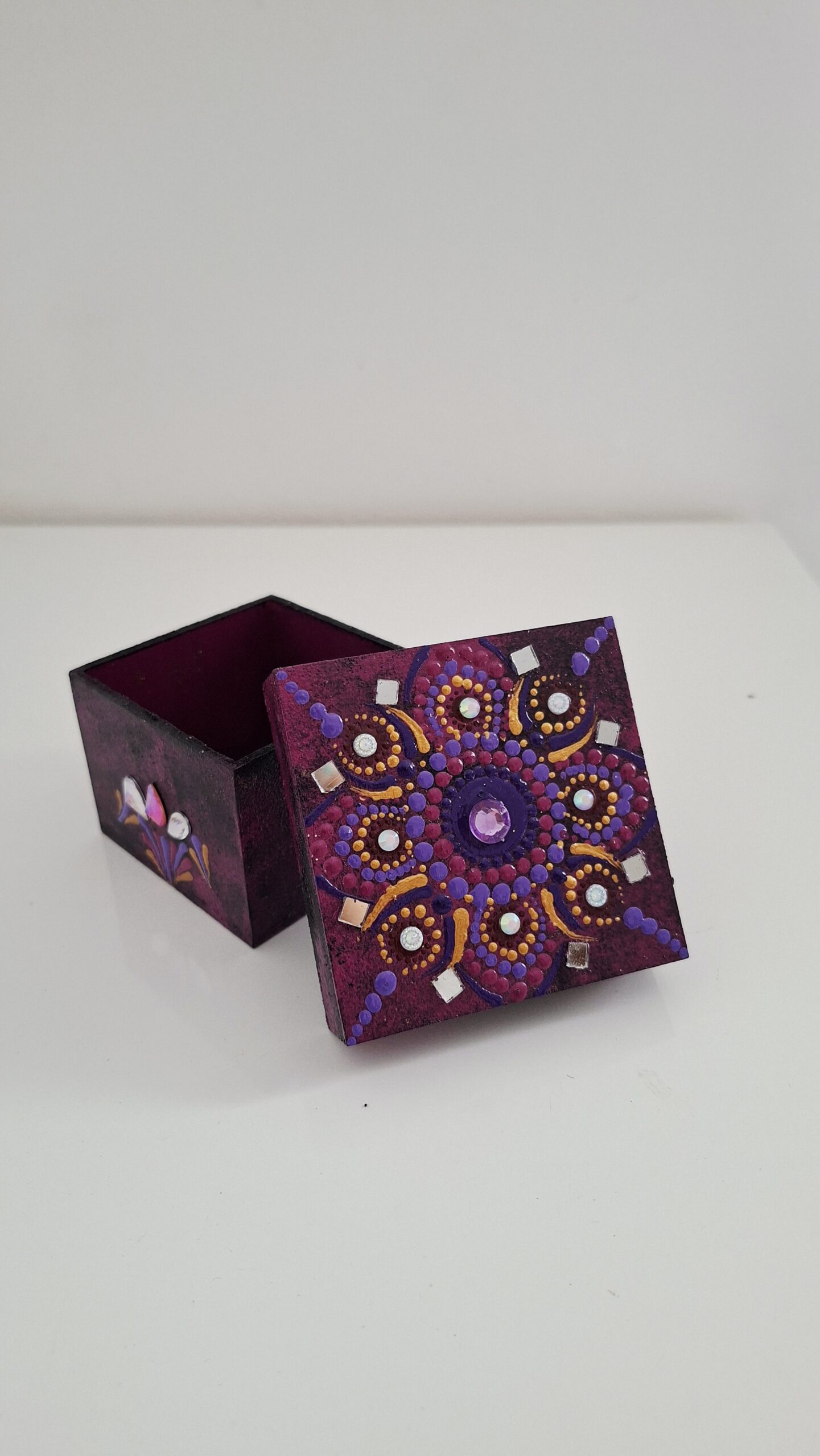 Caixinha com tampa, envernizada e com aplicação de cristal adesivo